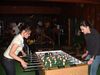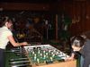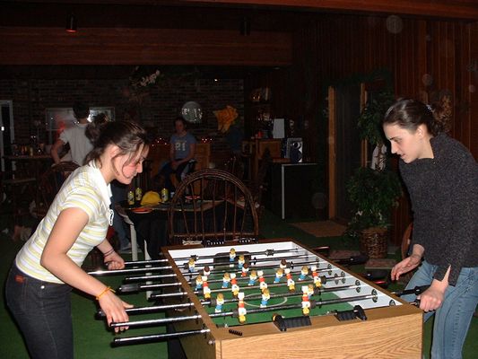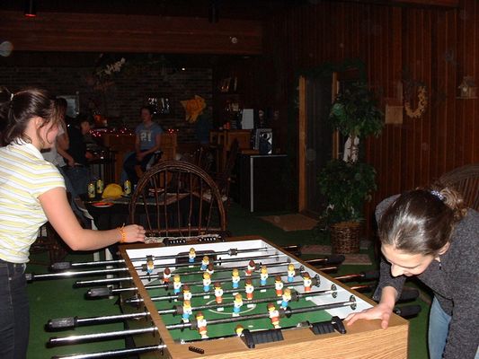 | When her bum's not in the picture, Jess is playing fooseball. |